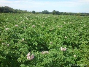 Посадку провожу в предварительно нарезанные и политые водой бороздки на глубину 6-8 см, то есть немного меньше глубины посадки клубней. Густота посадки — 70*15 см, так как именно при такой схеме каждое растение образует наибольшее число семенных клубней.