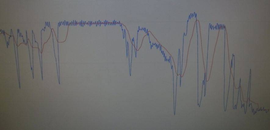 тут подобная картинка на плоттере выскакивает , на ровном плато где я руками не махал , видно что показания не стабильны пилой али синусоидой дрожат (следствие работы ламп) по этому участку среднее значение (красная линия) прямеханька по середине прет
