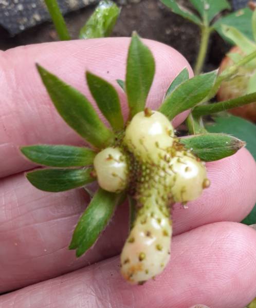 У меня тоже есть такой сюрприз:) На этом же кустике остальные ягоды были нормальной формы.