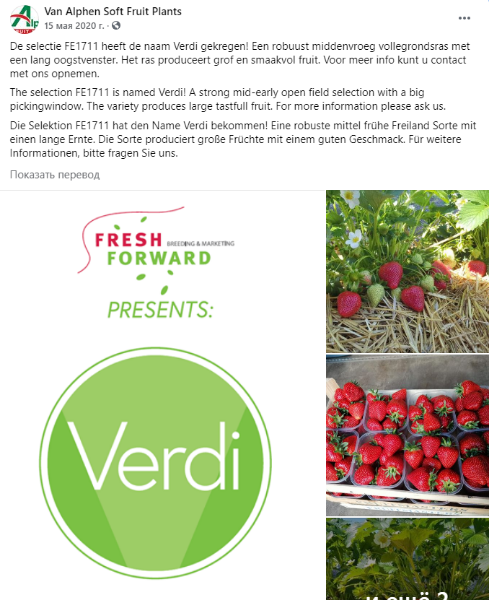 Выбор FE17111 получил название Verdi! Прочный сорт среднего раннего свободного ассортимента с длинным урожаем. Сорт производит отличные фрукты с хорошим вкусом. За дополнительной информацией обращайтесь к нам.
