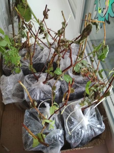 Я примерно в таком же состоянии получила, у малины стебли в плесени были, жимолость - без слез не глянешь. У всех растений верх был - ужас ужасный. Но корневая отличная! Верхи позачистила, пересадила одних в грунт, других в горшки - практически сразу у большинства жирные почки полезли.