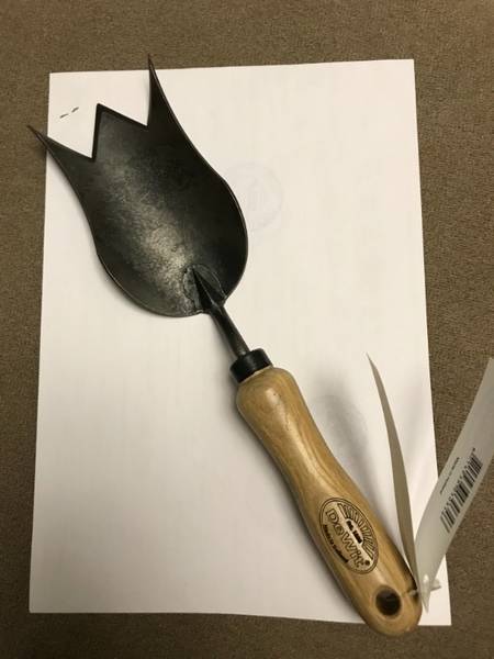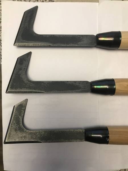 Длинный черенок - деревянный, крепко посажен - не шатается. Сам черенок лосный, очень хорошо обработан. Так же , как тюльпановые совки , все три ножа индивидуальны. Даже не смогла себе выбрать(похуже, что бы стыдно не было за товар), все хорошие, пришлось мужа просить, а он взял первый попавшийся - это твой. Нечего голову ломать.