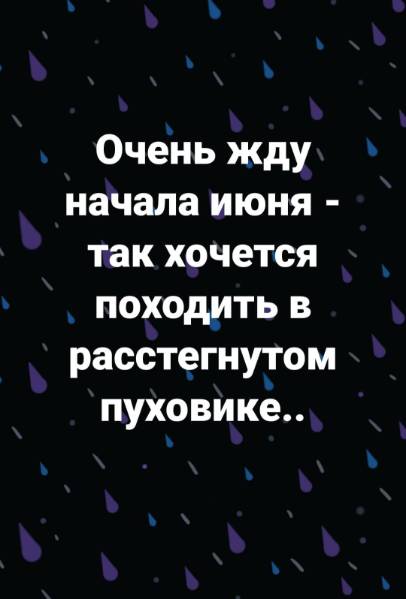 Девочки, я даже летом не могу назвать ту погоду, что у нас сейчас. Внучку в садик муж повёз. Надела тёплое платье, колготки , кофту,  курточку и сапоги????И это лето..... Хотела ей шапку нацепить. Так она сказала, что летом Шапки не носят...... ага........ куртки носят. Не помню я такого июня. Ночью окно закрыла, холодно. Сплю под тонким одеялом. И дождь опять лил под утро.