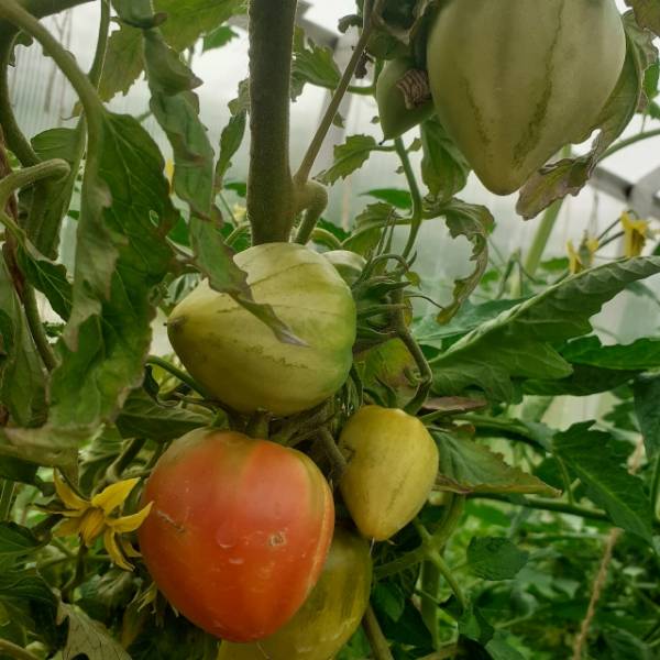 В теплице у меня и у соседки тоже моя рассада, рост кустов от 50 до 100см, цветут, но плодики маленькие. Сегодня вроде уже расти начали. Мне под них некогда было ямы копать с теплой подложкой, поэтому корни по ночам особо нечему греть.