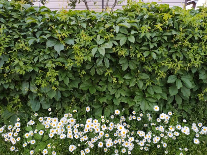 Всем привет! Мне сейчас сказали, что у меня самый красивый забор в нашем СНТ :mosking: :dance: У большинства глухой металлический, под ним трава покошена или заросли, если люди не живут. У меня сетка рабица, увитая девичьим виноградом, который я подравниваю 3-4 раза за сезон, под ним один раз в мае кошу, потом даю вырасти и процвести самосевным ромашкам, потом опять кошу. Вот на ромашки сейчас народ ходит и любуется.