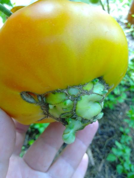 Всем привет. Обнаружила сегодня вот такую помидорину с "обезьянкиной попкой". Может, кто знает, почему она такая? И кушать-то такую можно?