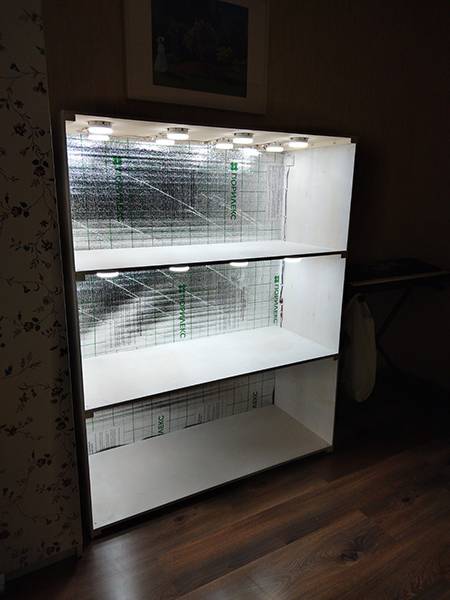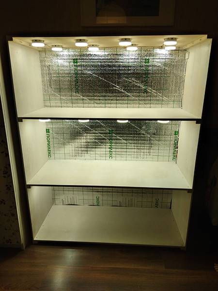 На фото на нижней полке не все лампочки были вкручены, поэтому на ней темнее пока.