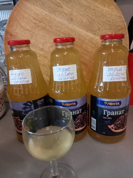 ну в общем я так делала: прокрутила очищенные от семечек не мытые яблоки. Ведро наверное или побольше немного. Получилось три банки 3-х литровые каши яблочной (яблоки взяла сладко-кислые) в каждую банку на глаз налила немного воды (чтобы мезгу чуть прикрыть) и всыпала где то  по 80 гр сахара. Накрыла тряпочками (которые в рулонах продают для уборки) под резинку. И мешки на них черные надела. Стояли в кухне. Поскольку масса густая не сильно видно брожение, но она стала подниматься и рыхлой. Я ее отжала не помню дней через 7-10. Получилось у меня этого сока 3-х литровая банка и 2-х литровая. Стало видно как бродит. Постепенно появился на поверхности налет. И начал выпадать осадок. Банки я всю дорогу двигала. поэтому уксусная матка (наверное) у меня не выросла. Ну и ладно))) Вот вчера слила через те же тряпочки (неверное месяц прошел). Добавила меда пару ложек. И в погреб отнесла. Как-то так...