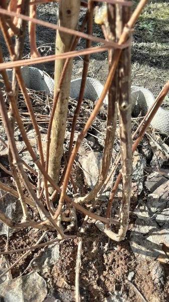Съездила сегодня на дачу.Снега нет совсем,но земля мёрзлая,посмотрела на свои МГ - как и говорила- ползать надо на коленках,чтобы их рассмотреть. С малышами всё отлично,по обрезке всё понятно,а более взрослые кусты связаны,их не развязывала,рассмотрела - жуть- всё кривое,косое,где-то обломано и почки увидела только наверху,как их обрезать пониже - не представляю.Поеду недели через 2 и если не будет снега,то попытаюсь.Вот для примера 1 куст.