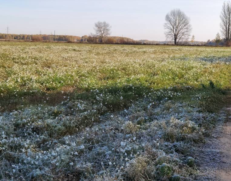 Вот и у нас такая картина! Где солнце достало траву, там она уже высохла, согрелась, а в тени все в серебре! И птичек уже мало видно.