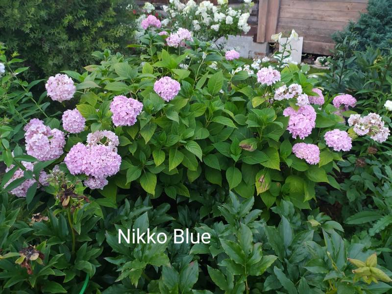 Вот для примера Nikko Blue в обычной почве без подкисления. Лошадке лет 8, не меньше. Ни разу не удалось получить чистый голубой цвет. Плюнула, растет розовой. Люблю. Всегда хорошо зимует.