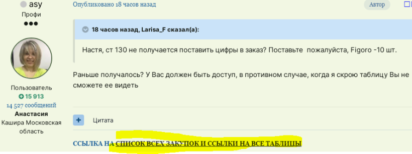 Если решите принять участие в закупке, заполните контакты, указав почту, привязанную к гугл-аккаунту, как прописано в первом сообщении. После этого напишите в теме, чтобы Вам дали столбик. И если Вы кажете почту, привязанную к гугл-аккаунту, Настя даст Вам доступ к редактированию таблицы.