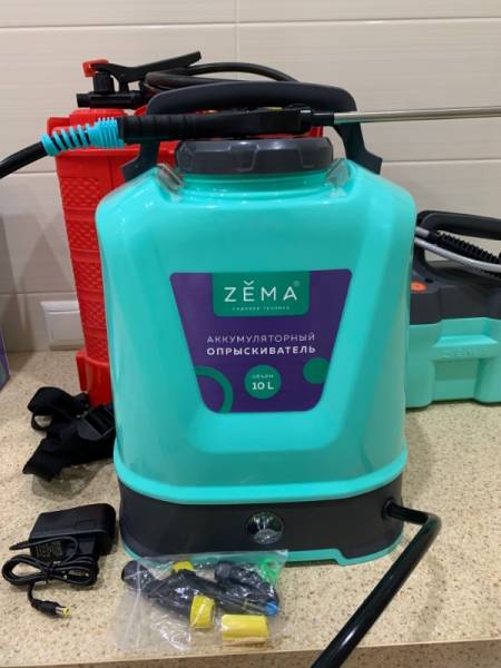 Он предназначен для обработки небольших объемов, поэтому он нежная няшка. Длинные удочки он не потянет, поэтому они не предусмотрены. С ним можно пойти в теплицу, цветник, кустики, клубника, маленькие молодые деревья. Большие взрослые деревья его насос не осилит- однозначно.