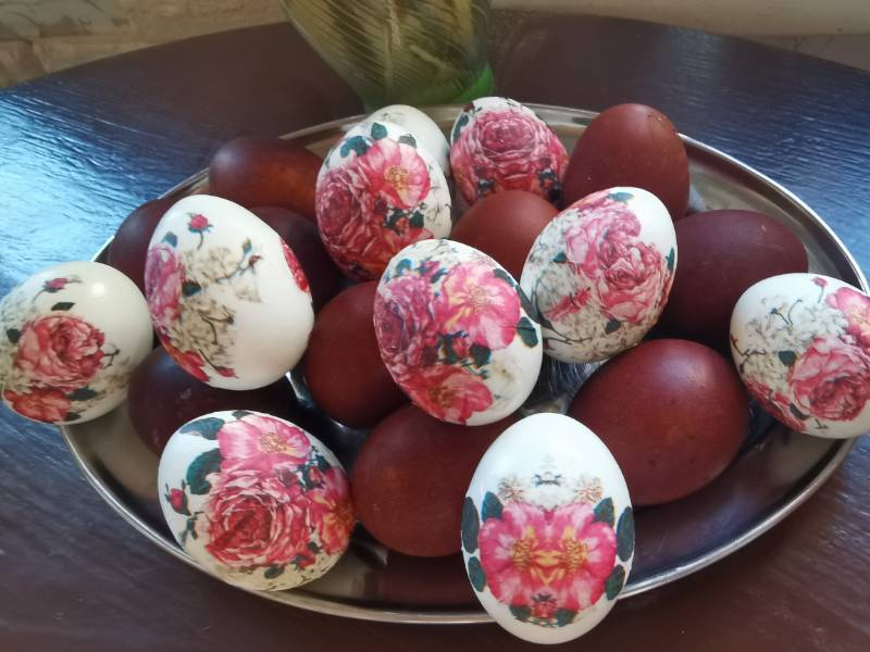 Каркаде в местных лавках не нашла. Дикие люди, что с них взять... :)) Накласила по старинке, в луковой шелухе. Ну и опробовала декупаж на яйцах. Порнавилось... :dance: