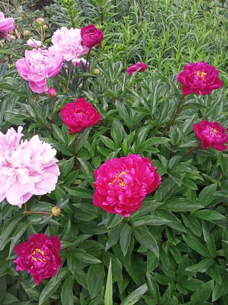Приехала я на дачу. Обошла пионы первым делом :cheesy: цветет розовая грядка в тени.  Хоть не выгорают, но стебли надо подвязывать, а то тянутся к солнцу.
