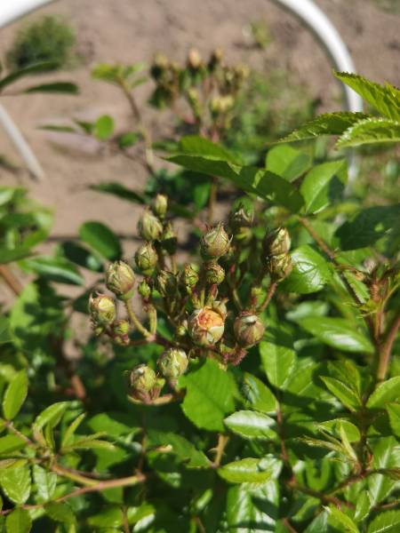 Сад на низком старте. Розы бутонятся, влаги конечно не хватает. У нас приимущественно пасмурно, темп +19 + 24. От дождей одно название, только пыть прибьёт и всё. Земля не промокает совсем.