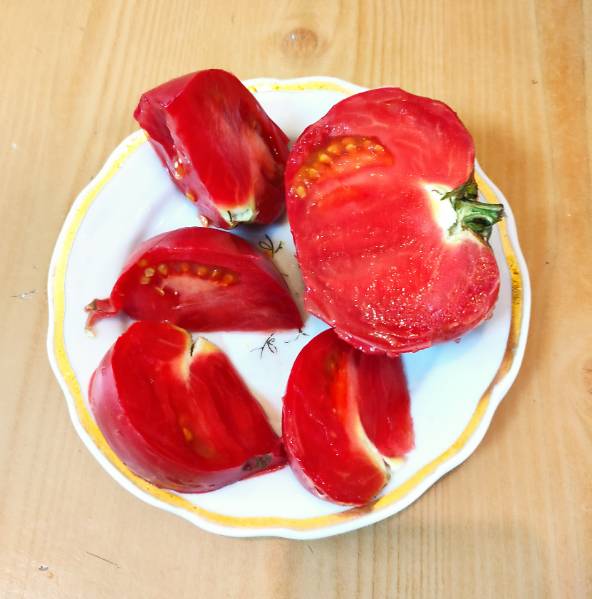 Попробовала я сегодня Кино.. Мне понравился,сладкий,с каким то фруктовым послевкусием. Мне встречались такие томаты с анто. У этого правда анто почти нет. Намек эдакий на синие плечики) А вот  Негро ди силекс кисловат...Хотя очень мягкий уже. Лежит на пробу БЛсердце и Итальянские сердечки.