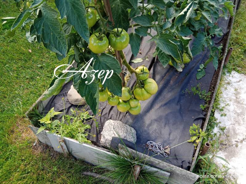Сегодня утром сходил к томатной грядке в ОГ и пообрезал нижние листья. кусты стали посветлее. Я вообще-то первый раз томаты в ОГ выращиваю. А сподвигло меня на это то, что вырастил слишком много рассады. Впихнуть невпихуемое в теплицу не получилось. Вот я и высадил десяток корней в открытой грядке. Сами понимаете, что сажал я на нее растения уже по остаточному принципу. какие получше оказались в теплице. Да и погода была холодной. Накрыл я их по дугам лутросилом. Растеньица были чахлыми, и я решил их подкормить. И, видимо, перестарался: с наступлением тепла стали жировать. Но перекорм отрицательно сказался не на всех кустах. Например плоды сорта Желтый крупный в ОГ крупнее чем в теплице. Было у меня два корня томатов, семена которых я взял из покупного помидора. Томаты были азербайджанскими. Поэтому я и назвал их "Азер". В теплице куст - ничего выдающегося. А в ОГ - красавец.