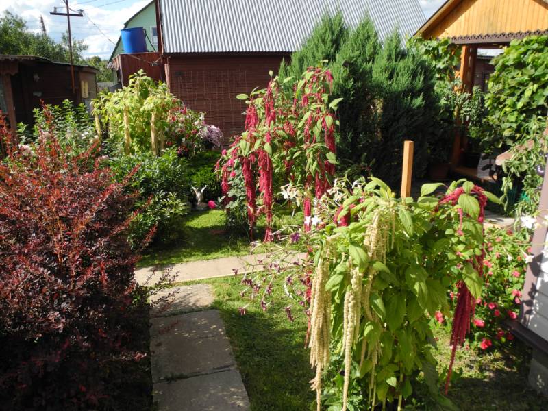 Амарант хвостатый Вдохновение - это теперь мой любимый однолетник наряду с душистым табаком, второй год выращиваю, уже из своих семян. Вот это красное дерево в виде плакучей ивы с меня ростом- всего лишь одно растение. На рассаду сеяла в теплице в ногах у помидор и рассадила там пореже. Высаживала в июне уже крепким саженцем высотой 40-50см. Поначалу прикрывала от солнца и ветра укрывным. Которые раньше на ПМЖ высадила и пучками - те скромнее размерами.