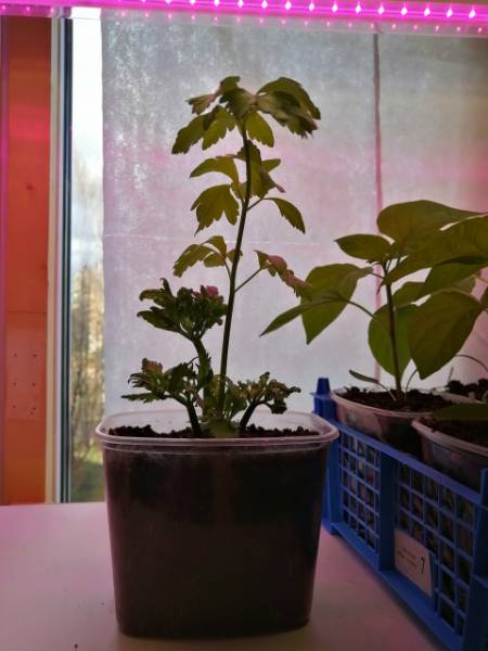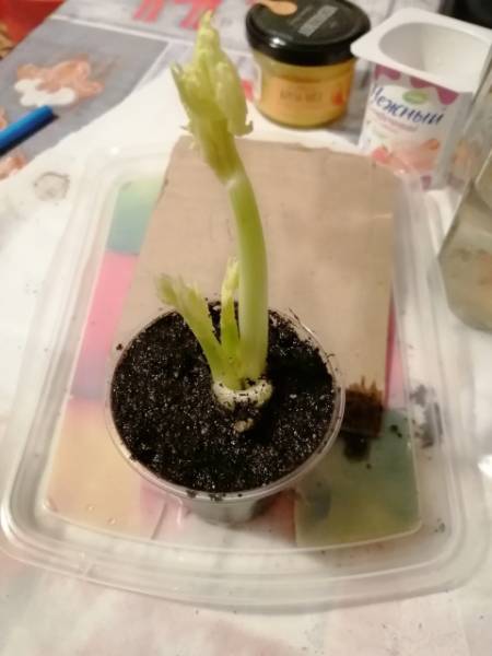 В стакане с небольшим количеством грунта пока сидит. Как корешки побольше ком оплетут - пересажу в тару побольше. Скорее всего уже в городе. Пока только показываются единичные корешки у стенки стаканчика.
