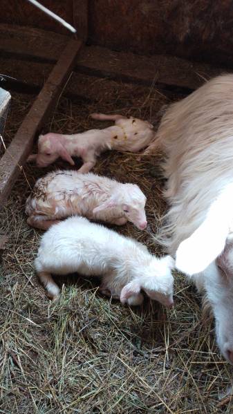 Ффух.Пришла домой на обед,а в сарае козлёнок уже сухой облизанный лежит.Побежала за дочей,еле успели.За 10 минут ещё двое родились пулей прямо.