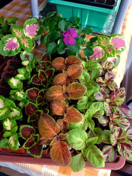 Сегодня порадовал первым цветочком бальзамин. Колеусам уже тесно. Как же не хочется ещё и их рассаживать просторнее. «Денег  Места жалко не было, денег места просто не было...»:sad: