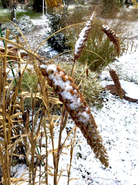 Людмила, ты ещё интересуешься декоративными злаковыми? Мне этим летом понравилась Чумиза Коломенская. Такие колоски эффектные. В рассаде хиленькая была, а потом вымахала красотка. Может её нужно сразу в грунт сажать? Вот фото уже с наступлением холодов. Через пару дней колосков не было. Сороки раскушали, всё общипали, обмолотили. Так что , у кого куры-попугаи, рекомендую: