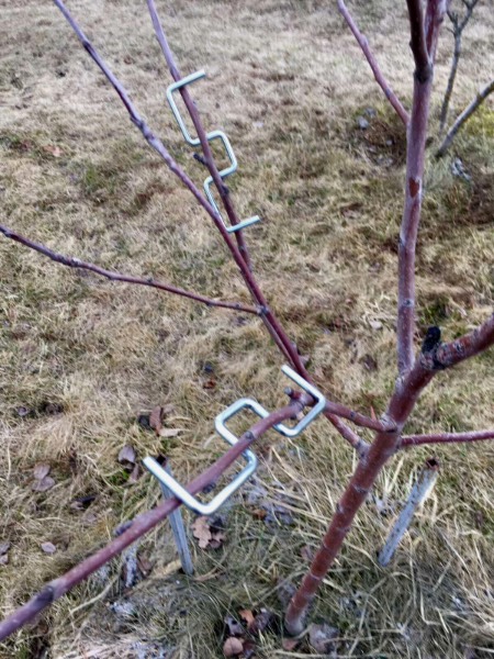 вот так это выглядит. Скобы в длину размером с ладонь. На веточках , толщиной не сильно превышающей карандаш, крепятся легко и позволяют отклонить ветку от вертикали. Раньше для этих целей я крепила шпагат с утяжелителем (пластиковые бутылки с водой) или растяжку к закреплённому в земле колышку. Не очень было удобно. Посмотрю, что даст такой способ.