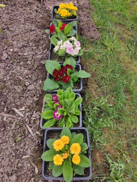 Марина, а горшки одинаковые по размеру? Или те, которые вкопаны, чуть больше, чем с цветами? А где зимуют примулы и другие многолетники?