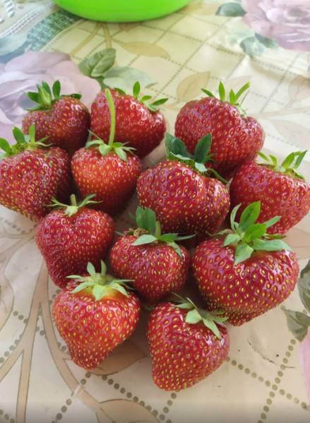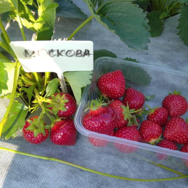 С прошлого года моя москова супер. Я всегда сажу в двух местах для определения болявости и урожайности. Так она везде себя показала на 5+. У меня она была крупнее чем у Светланы  Витальевны. Первая ягода очень крупная, потом чуть мельче, но всё равно не мелкая. Ягода очень и очень ровная и красивая, с очень сильным блеском. Кусты к осени отлично наростили рожки, которые не выпирали из земли. Аромата не много, но и не мало. Плотненькая, но сочная. Себе поставила 10 . Эти 10 уже на размножение. Усами не заваливает, но их достаточно.