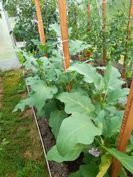 Баклажаны просто огромные кустищи нарастили. Но к ним мы сразу палки поставили. А к 27 кустам перца это проблематично. Думала, сделать по периметру общую подвязку как ринг, но что-то поленилась. Пока подпорками обхожусь. Баклы тоже уже плодят. Но пока еще не доросли, думаю через недельку начну первые снимать.