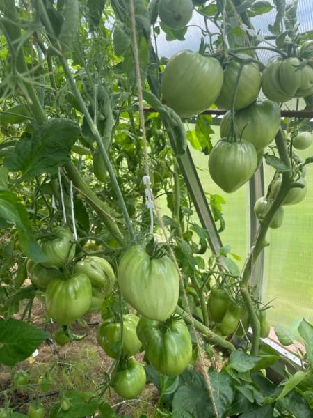 Радует кистями сорт Бычок от Ярославны. Навязал много, по пока ничего не спеет. Верхушки и у него пустые. Я его хотела сравнить с Фатимой, но она замерзла.