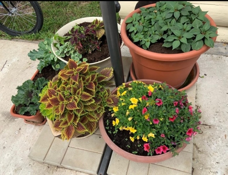 Искала фото , нашла только колеусы в начале сезона . Я миксы в кашпо делала , в августе горшков не видно был, красота . На солнышке и в теньке разные по окрасу . У меня 5 колеусов всего сейчас  из прошлогодних . Из семян посадила , но всего два взошли . Вот фотки только такие нашла