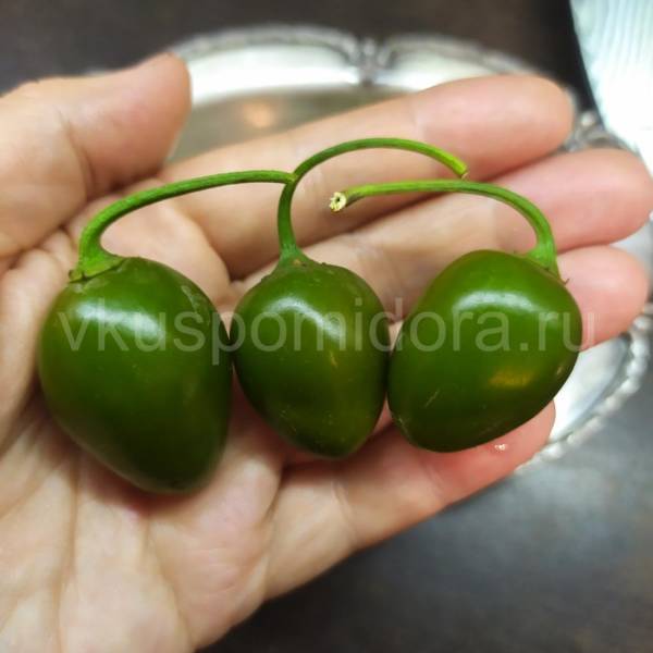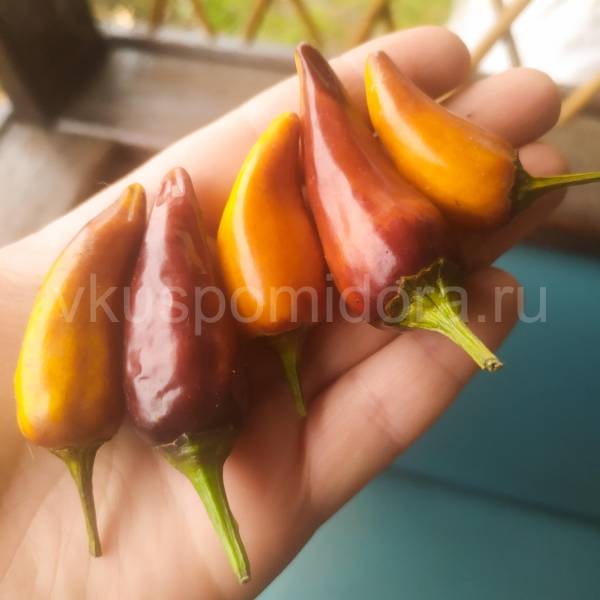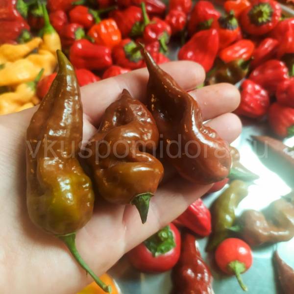 Плоды цвета созревающих оливок, постепенно темнеют и размягчаются. На кусте долго не висят, слишком мясистые, поэтому нужно следить и вовремя срывать. Созревшие легко отделяются от плодоножки, сами падают при прикосновении. Мякоть оранжево-желтая, очень сочная! Вкус отличный – сладкий, фруктовый и очень острый. Используется как для свежего потребления, так и для приготовления соусов и джемов. Хорошо переносит заморозку.