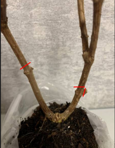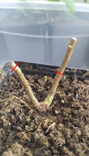Здраствуйте! :hat:Подскажите как надо и как лучше. Есть обрезанный саженец, но на первых узлах проснулись по одной почке, с одной и другой стороны. Надо на них обрезать? ?