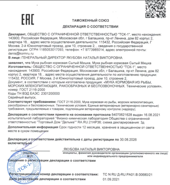Была у меня еще отложена мука от Зоокорм. У неё цена ещё интересней, чем у Сытого мишки 5 кг всего за 493 рубля. Но производитель какой-то мутный, там ни состав толком не указан, ни процентное содержание протеина, ни ГОСТА... и даже ТУ нет, сертификат тоже не нашла.