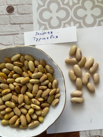 На листке бумаги рядом с тарелкой на верхней фотке семена туршевой зеленой, у которой  еще не полностью высохли створки ( не до хруста). Сначала эти фасолины крупнее и светлее. Потом по мере высыхания створок, сами фасолины  усыхают в размере и приобретают оливковый оттенок