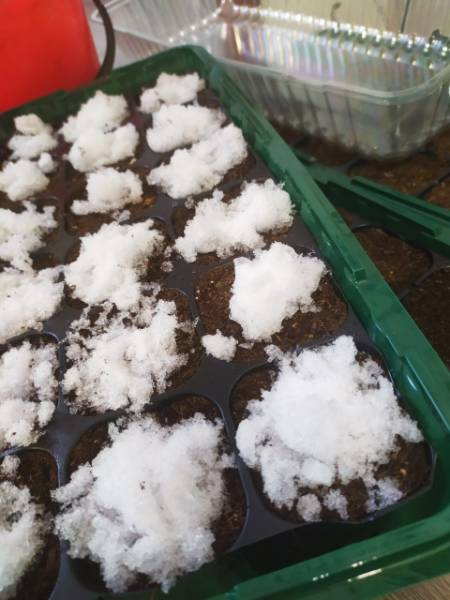 Скоро и я начну посевную. Списки готовы, бирки подписала .   Грунт прогрелся , сегодня наполнила им ячейки, а сверху положила снега  и накрыла крышками . Всё готово.