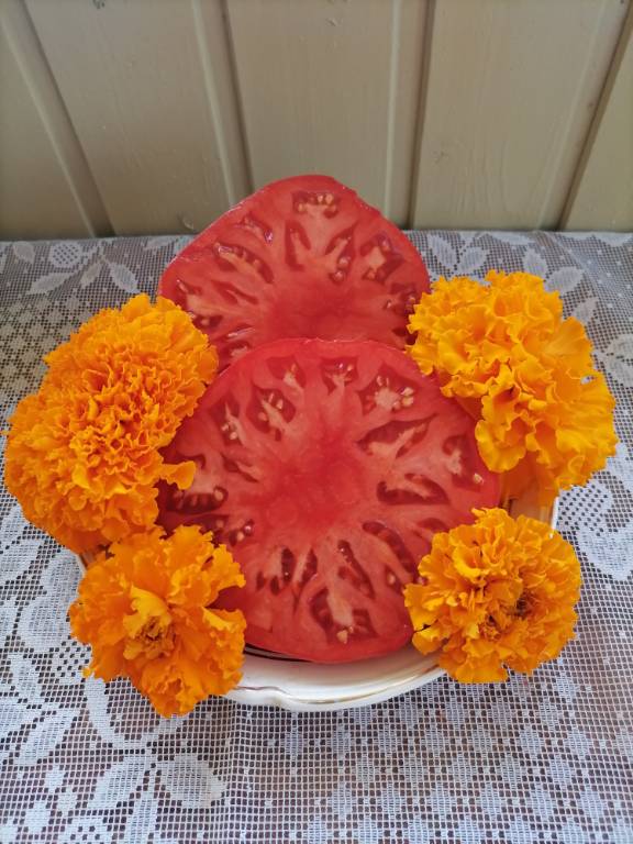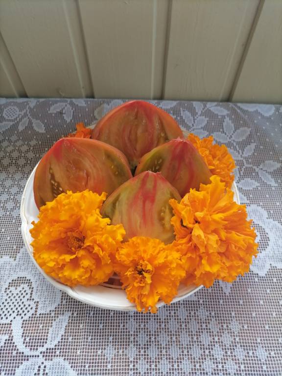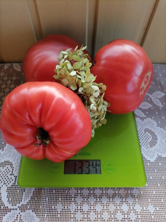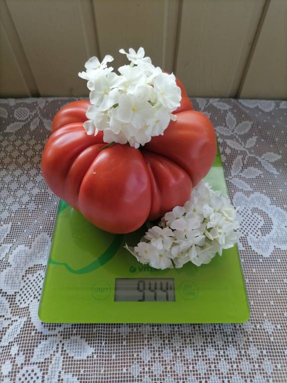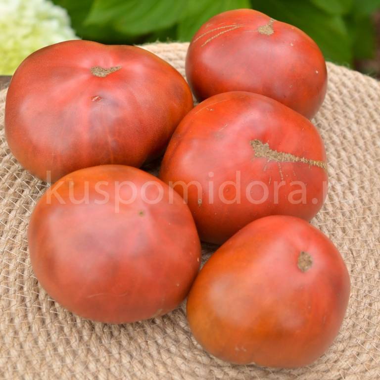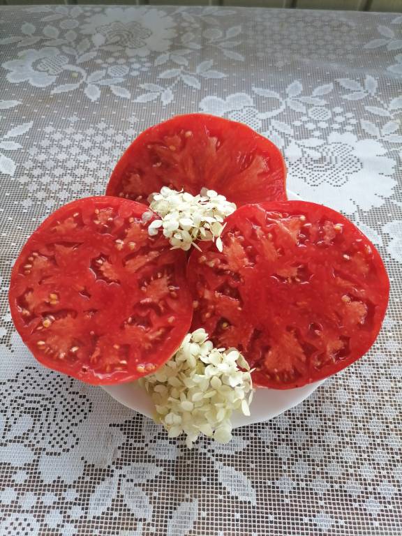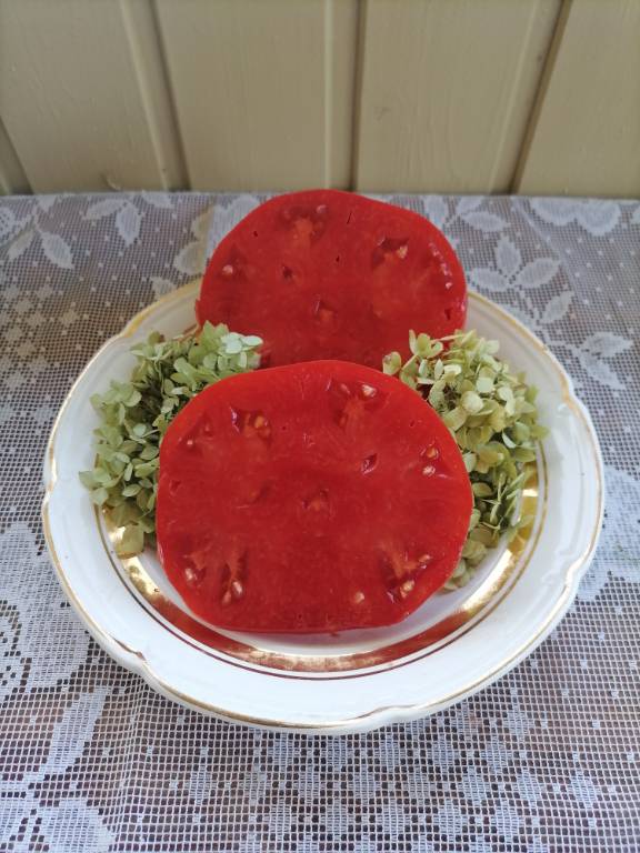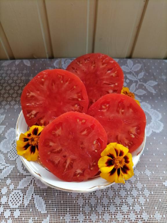 Мощный, ср. поздний, густо облиственный, 2+м. Плоды красные, плоскоокруглые, с ребристостью на плечах. Вкус насыщенный, томатный, кислота слабо выражена!!! Арбузная, сахаристая мякоть. Очень вкусный в салатах!!!