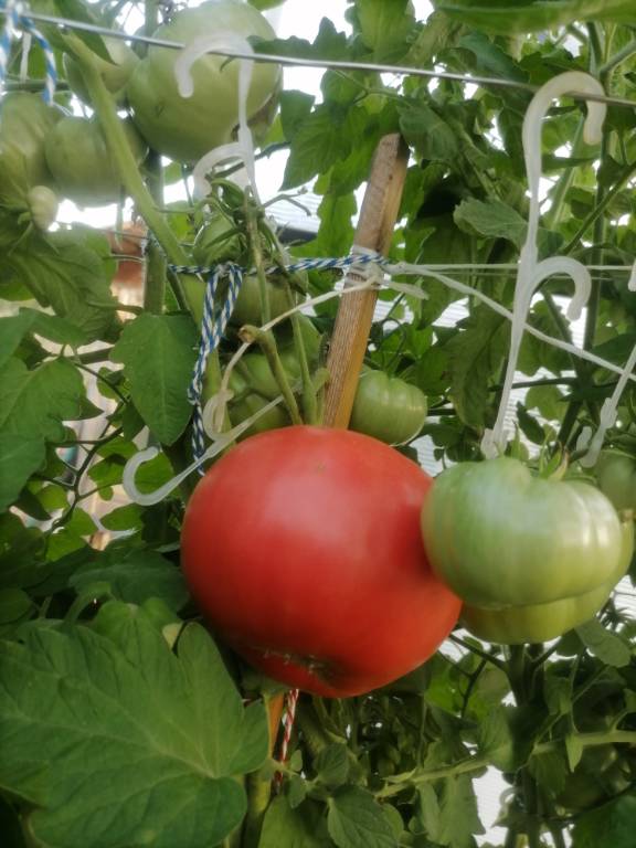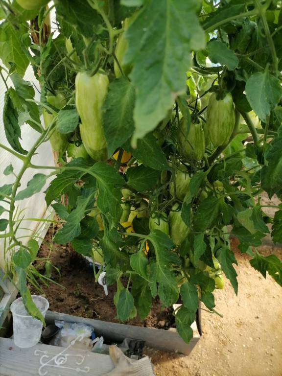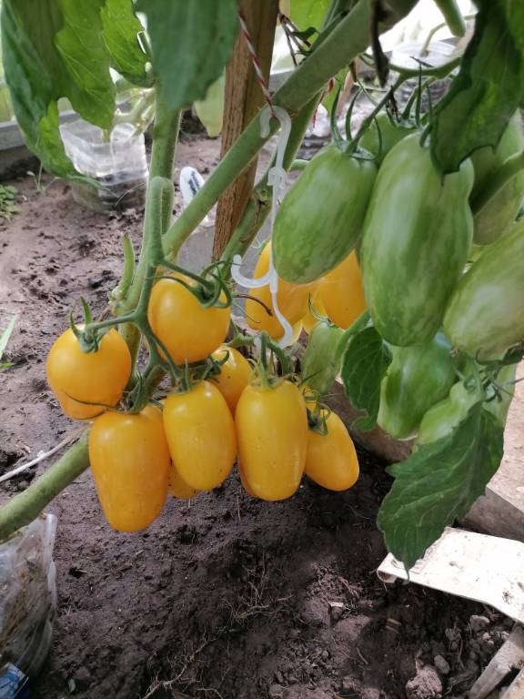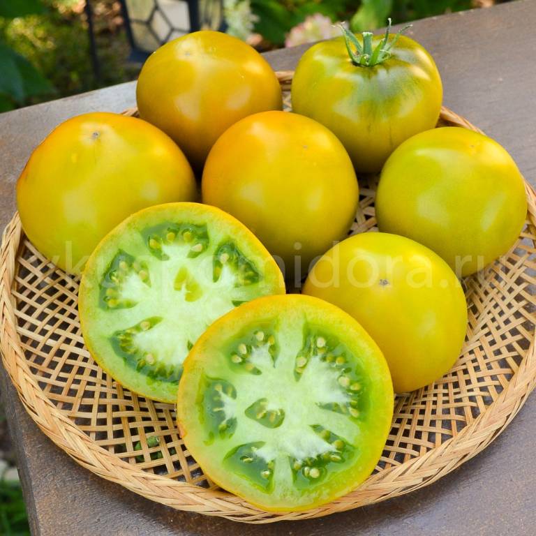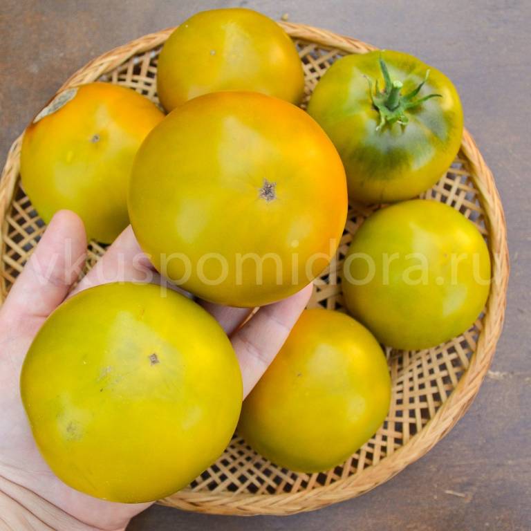 Высота до крыши парника, облиственность хорошая,можно сажать на боковушку, ср. спелый. Плоды не крупные, цвета охры, плоскоокруглой формы, с темно-зелеными штрихами. Вкус с фруктовой кислинкой. Долго раскачивала сорт, чтобы добиться хорошей урожайности!!!