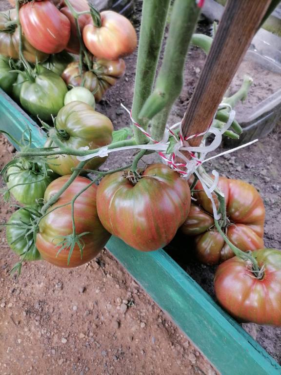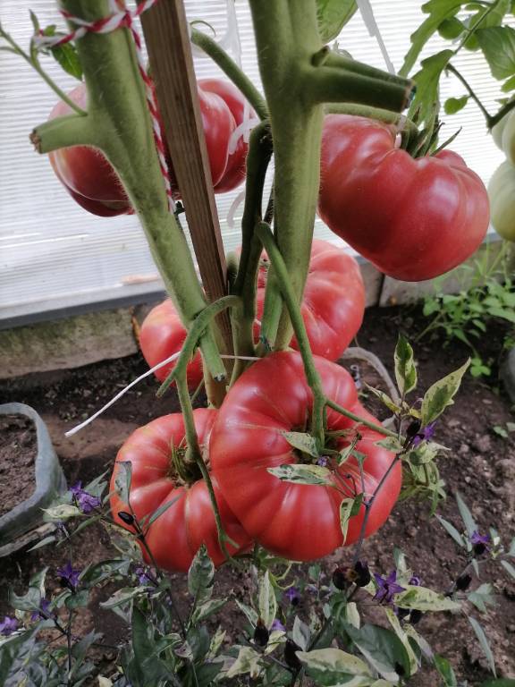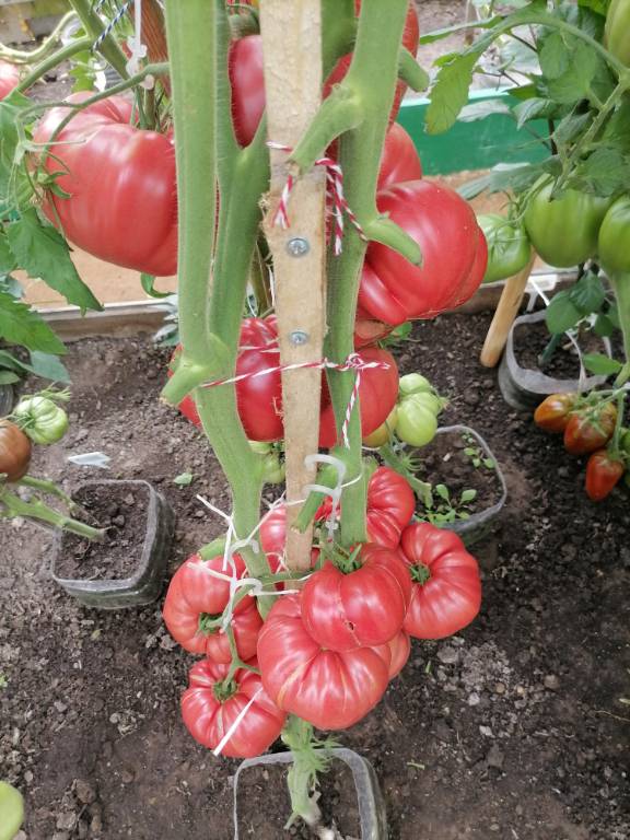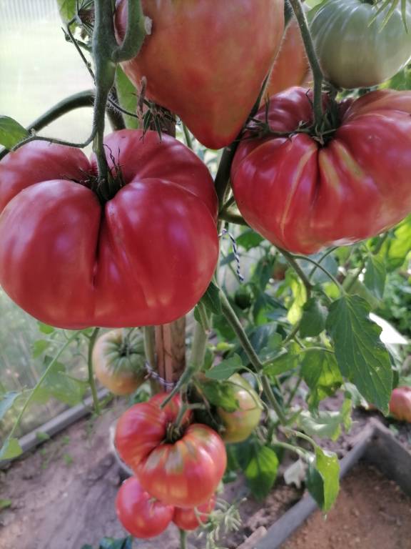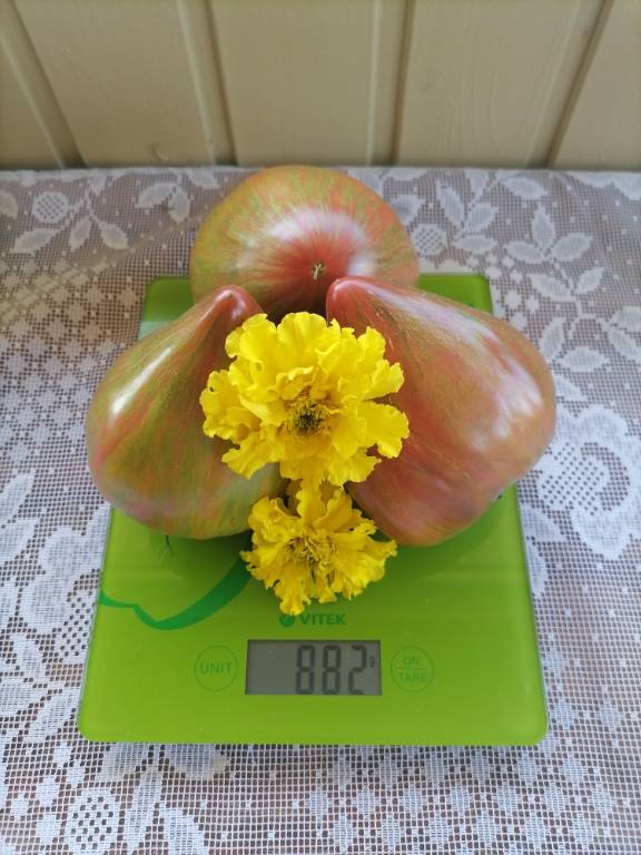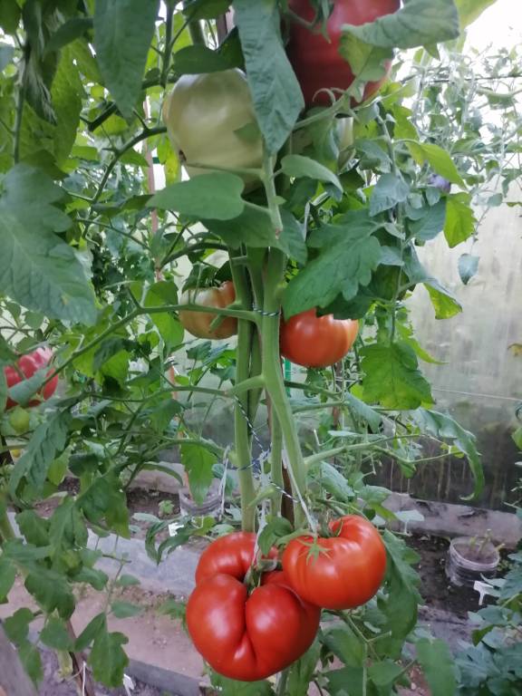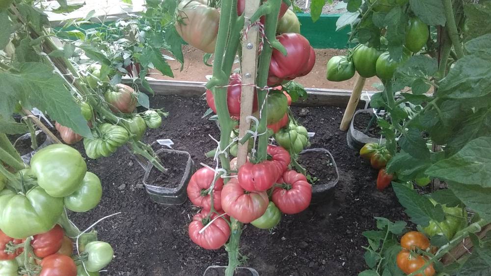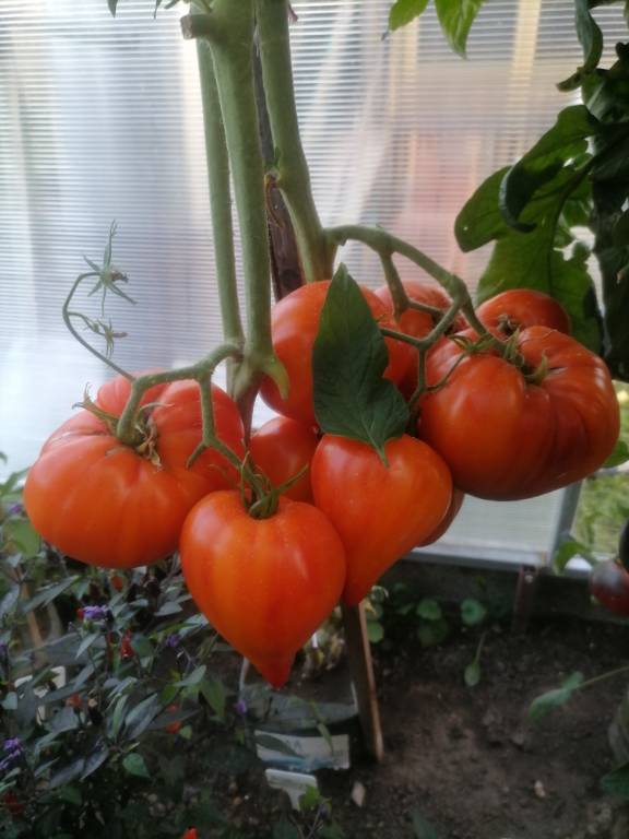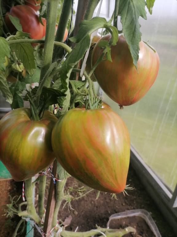 Высота в теплице 2+м, куст крепкий, хорошо облиственный. Плоды остроконечные биколорные сердца, красивущие, слов нет. Я вообще таю от "носиков"!!! Плотные, мясистые,сладковатые плоды, с преобладанием фруктовой кислинки. Хорошо лежали!!!