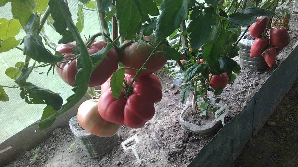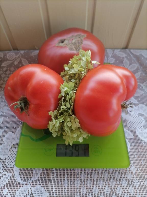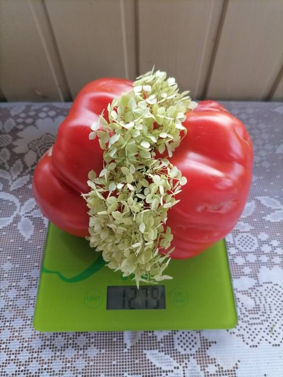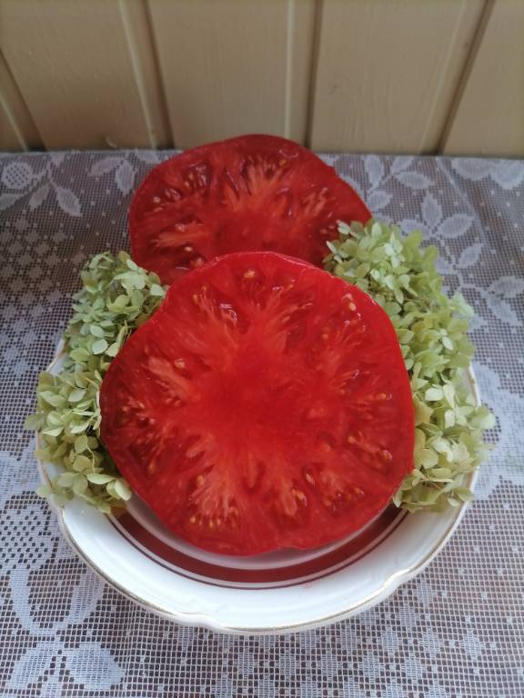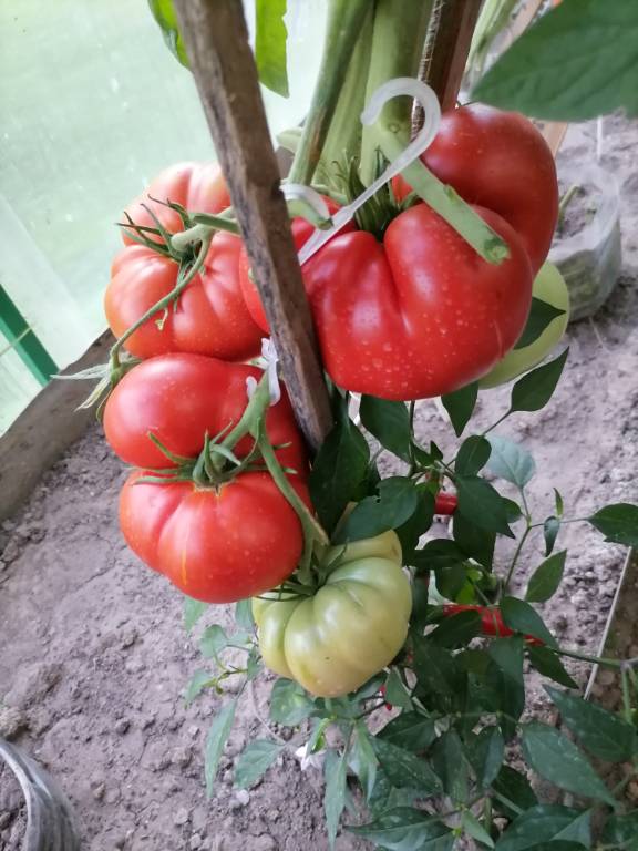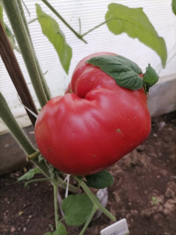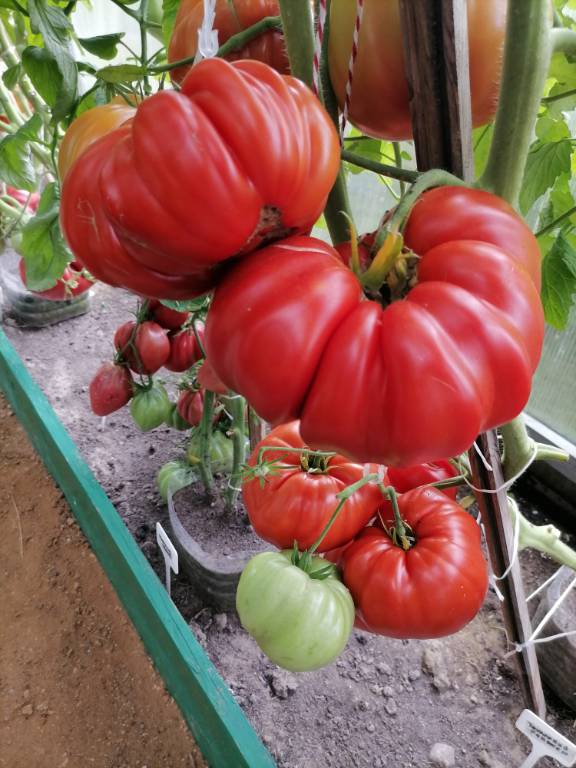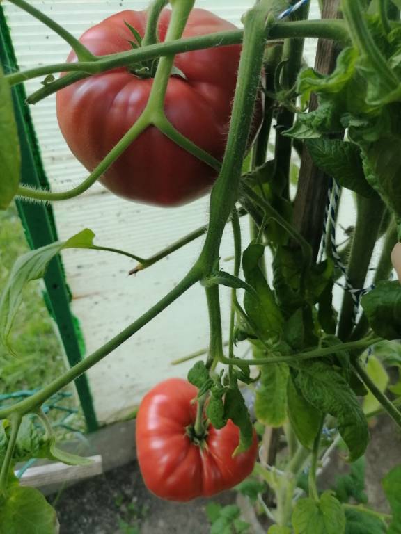 Высота 2+м. Куст сердцевидного строения, крепкая, стройная лиана, если хорошо кормить, довольно мощная, ср. поздняя. Плоды очень крупные красные,  плоские  сердца, с небольшой ребристостью от плодоножки до вершины плода. Мясистые, мало сочные!!! Вкус сладкий!!! Вызревает без плеч!!! Пошёл в З. список!! Сорт старый, семена давно лежали. Растила первый раз!!! Понравился больше, чем Акви Терме!!! У меня был очень урожайным, не смотря на то, что его любит вершинка!!! Плодоносит до последнего!!! Шикарный сорт!!!