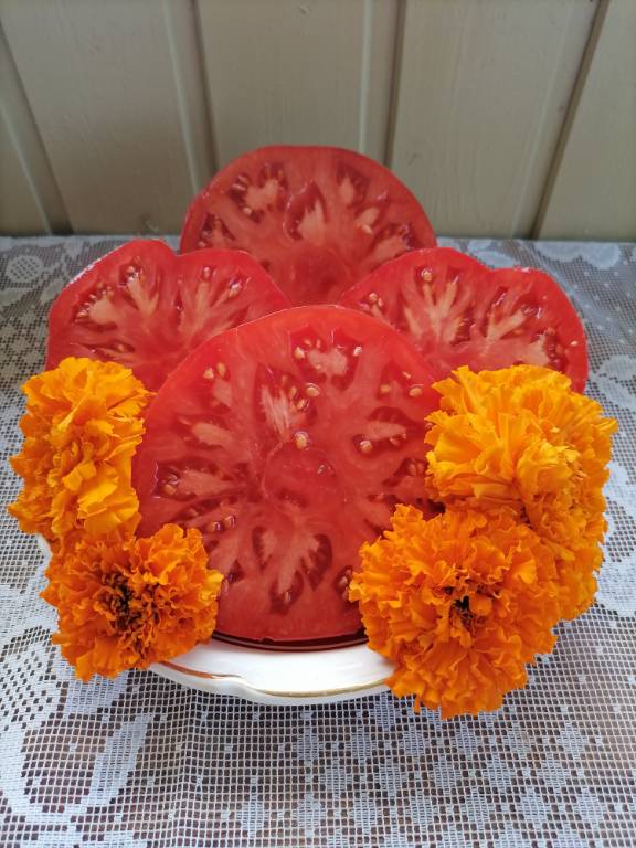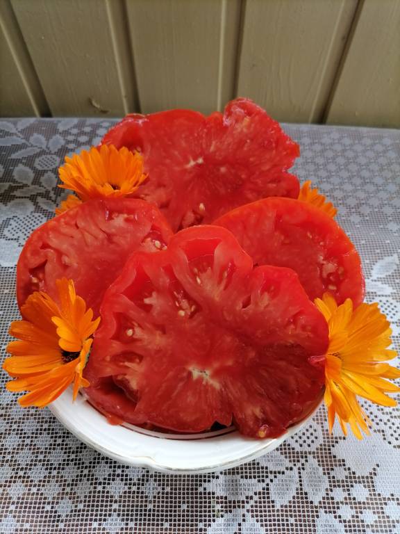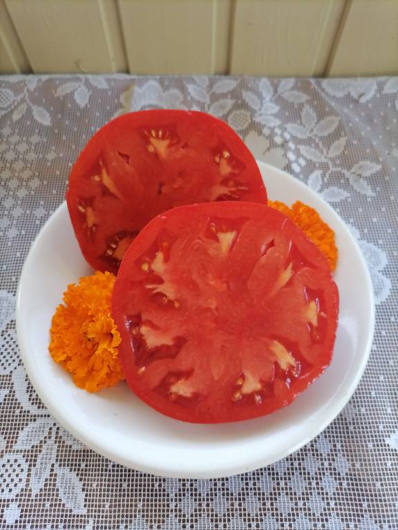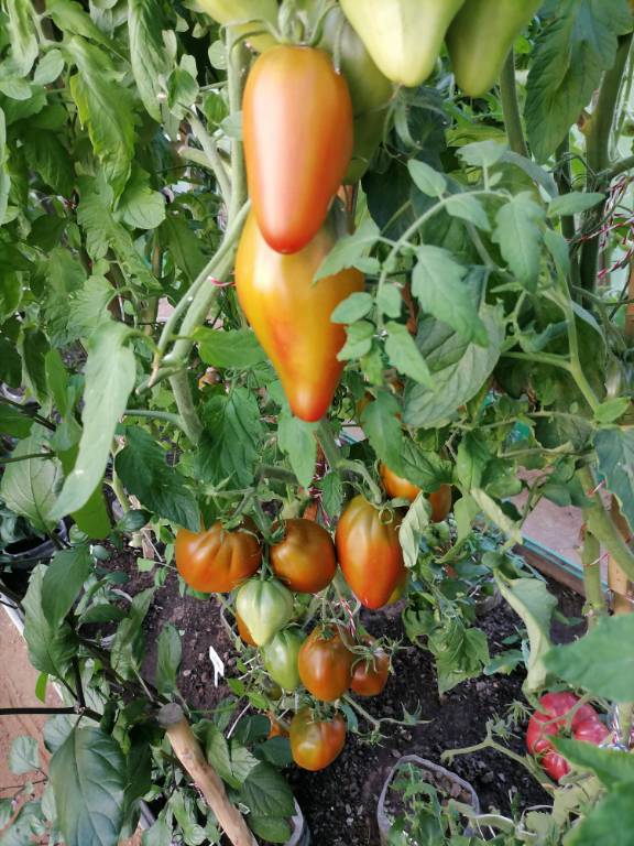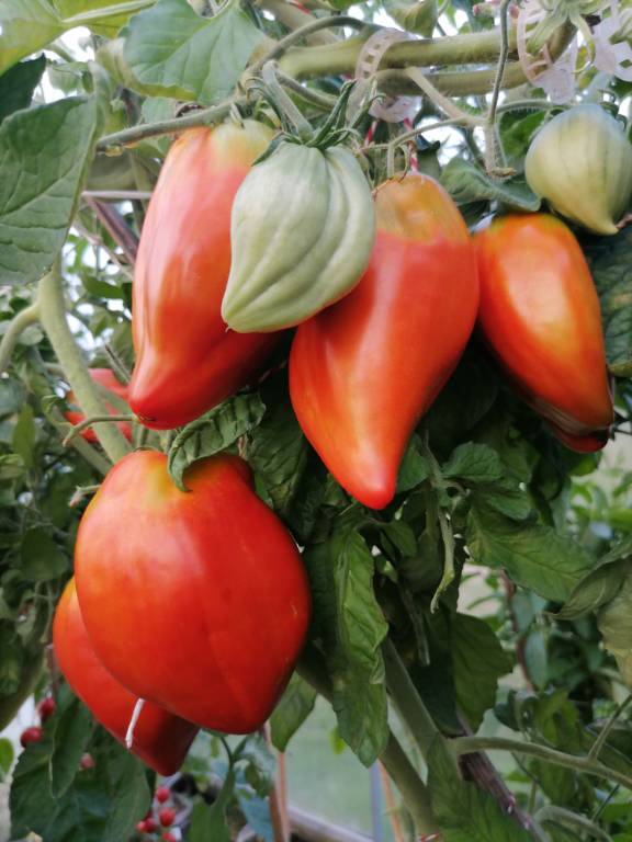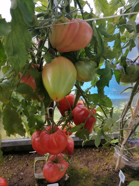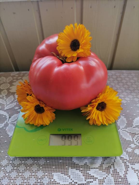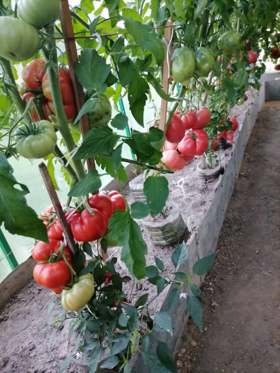 Высота 2+м. Куст сердцевидного строения, крепкая, стройная лиана, если хорошо кормить, довольно мощная, ср. поздняя. Плоды очень крупные красные,  плоские  сердца, с небольшой ребристостью от плодоножки до вершины плода. Мясистые, мало сочные!!! Вкус сладкий!!! Вызревает без плеч!!! Пошёл в З. список!! Сорт старый, семена давно лежали. Растила первый раз!!! Понравился больше, чем Акви Терме!!! У меня был очень урожайным, не смотря на то, что его любит вершинка!!! Плодоносит до последнего!!! Шикарный сорт!!!