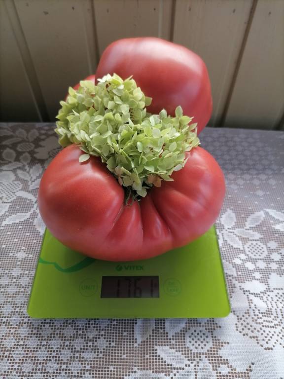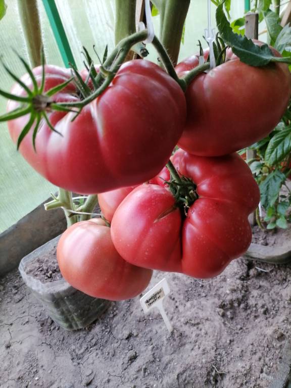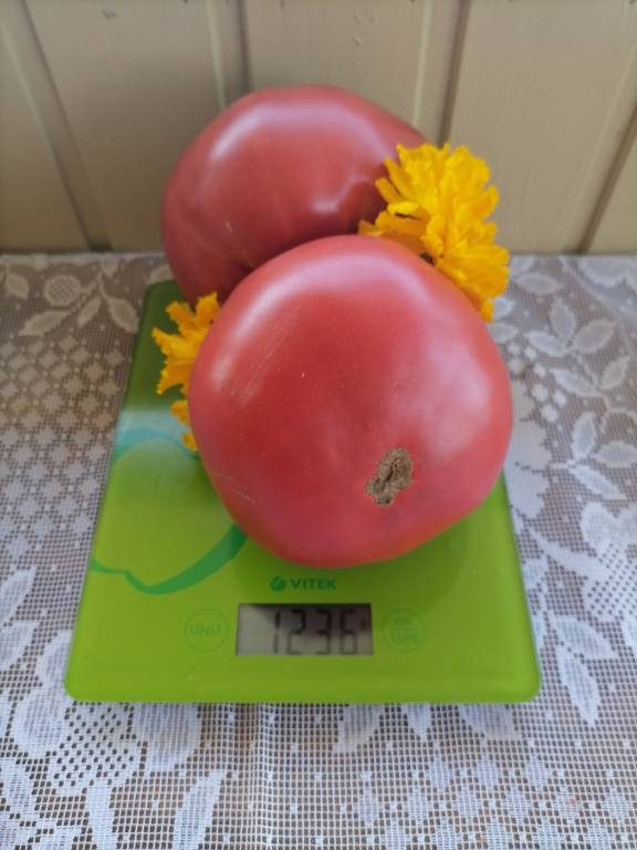 Куст у меня был довольно хилый, 1,8м, рос на боковушке, лист длинный, простой. Плоды красивущие розовые сердца, плотные, с изящным носиком.Сладость на 5, есть чуть кислинки в послевкусии!!! Тот старинный вкус добротного розовоплодного томата, подтверждаю!!!  Мясистый, сочный!!! Урожайность была просто огромедной, я их срываю, а они опять нарастают!!! Убирала куст с зелёными плодами!!! З. список!!! Обалденный сорт, ещё одна изюминка этого сезона!!!