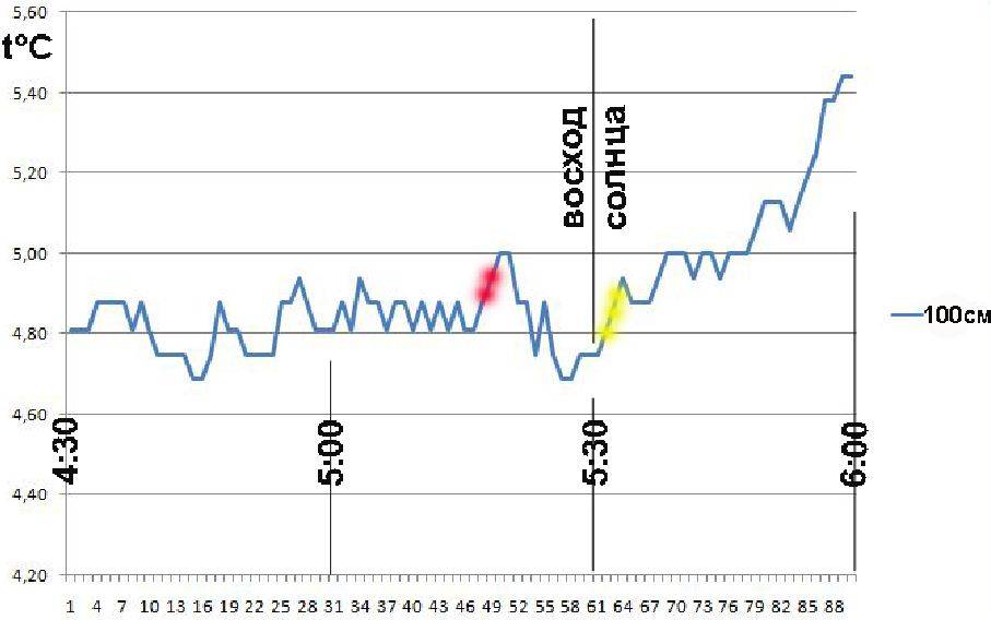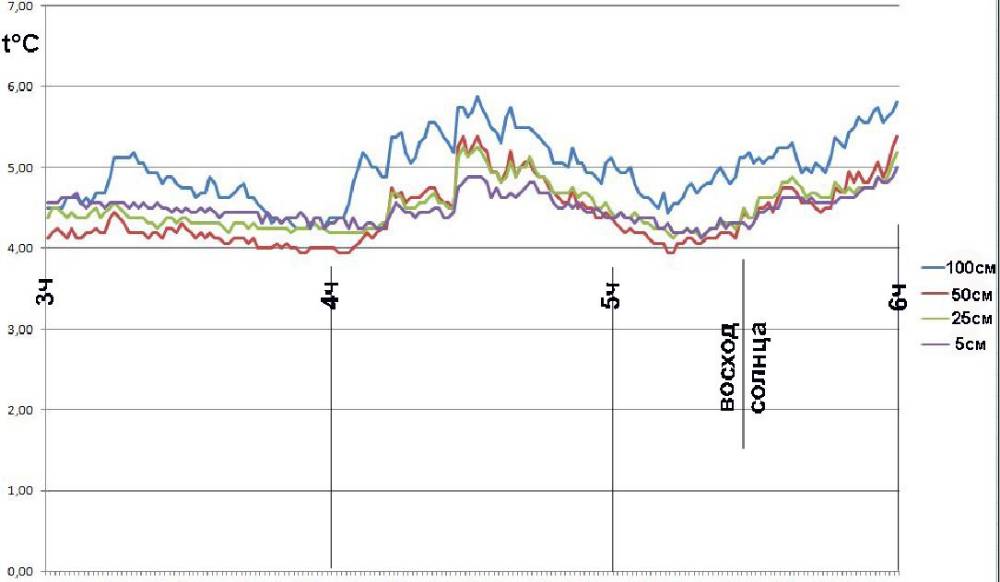 К 5 утра вообще температура у земли практически сравнялась с температурой на метровой высоте