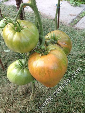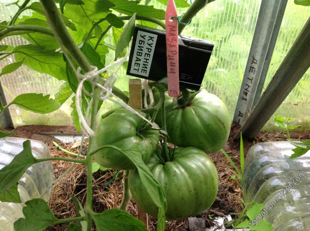 Леночка, а у меня Мазарини другой формы. Сажала из семян Биотехники в 2011 году. Первый плод был на 1100 гр., но он был в первой кисти один. Первую кисть закладывает после 7 листа. Я его в этом году и посеяла поздно и уронила. Стоял в воде, а потом высадила. Первую кисть сбросил, а на фото вторая кисть.