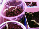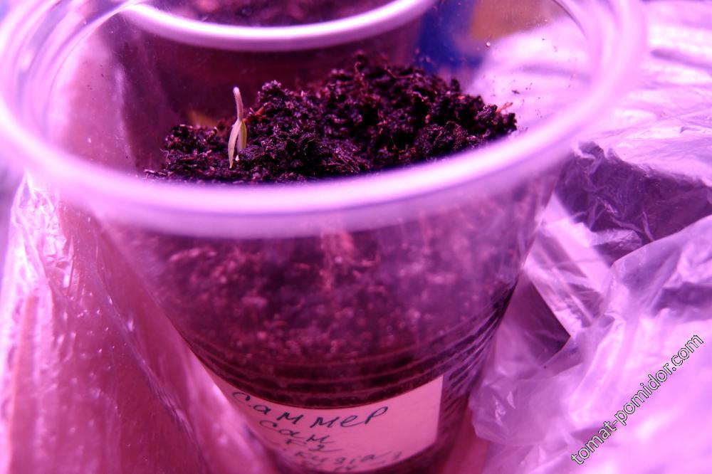 Дим! Экспериментальные F2 - всего четыре дня назад посадила, без всяких замачиваний, просто кинула семена в землю и всё.  Фаворита пока молчит, а Саммер Сан - сегодня уже взошел один росток, с виду нормальный, только по сравнению с перцами - тоненькие такие семядольки.