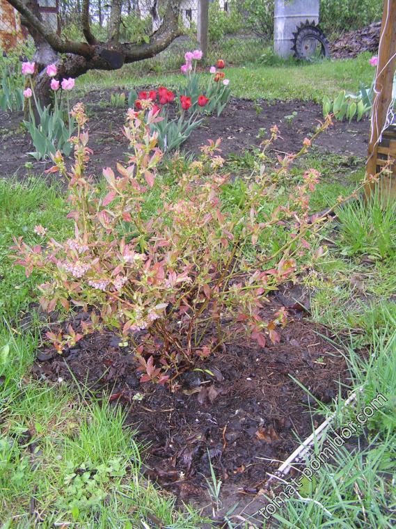 ...Каждый раз забываю написать -  кто интересовался, тот помнит,  что  я в прошлом году сажала голубику "по науке". Так вот этот кустик, посаженный "правильным" способом, очень меня радует - он очень хорошо окреп и подрос за прошлый сезон  и сейчас весь усыпан бутонами...