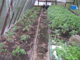 Еще в теплице посеяны и растут салаты, их еще надолго хватит.  Но их убирать не буду, пусть пока растут. Я их сеяла так, чтобы они не мешали помидорам. Помидоры буду высаживать между рядками салатов.