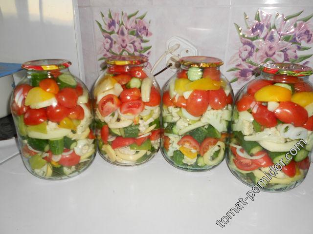 Рецепт:На 3х литрвоую банку :!головка лука ,кольцами ,1 гол.чеснока ,8 штук душистого перца ,веточками цветная капуста ,кольцами кабачок ,огурцы по 5 см,режем помидоры на части ,перец красный ,жёлтый ,зелёный,можно любой ,тоже режем на 4 е части .На дно банки ложим укроп ,всё остальное укладываем рядами.Заливаем кипятком,даём постоять 10 минут ,сливаем воду в кастрюлю,снова кипятим ,в эту воду добавляем 2 стол ложки сахара ,1 стол ложку соли (лучше 2) ,и десертную локжу уксуса и заливаем в банку .закручиваем .Готово!На здоровье!